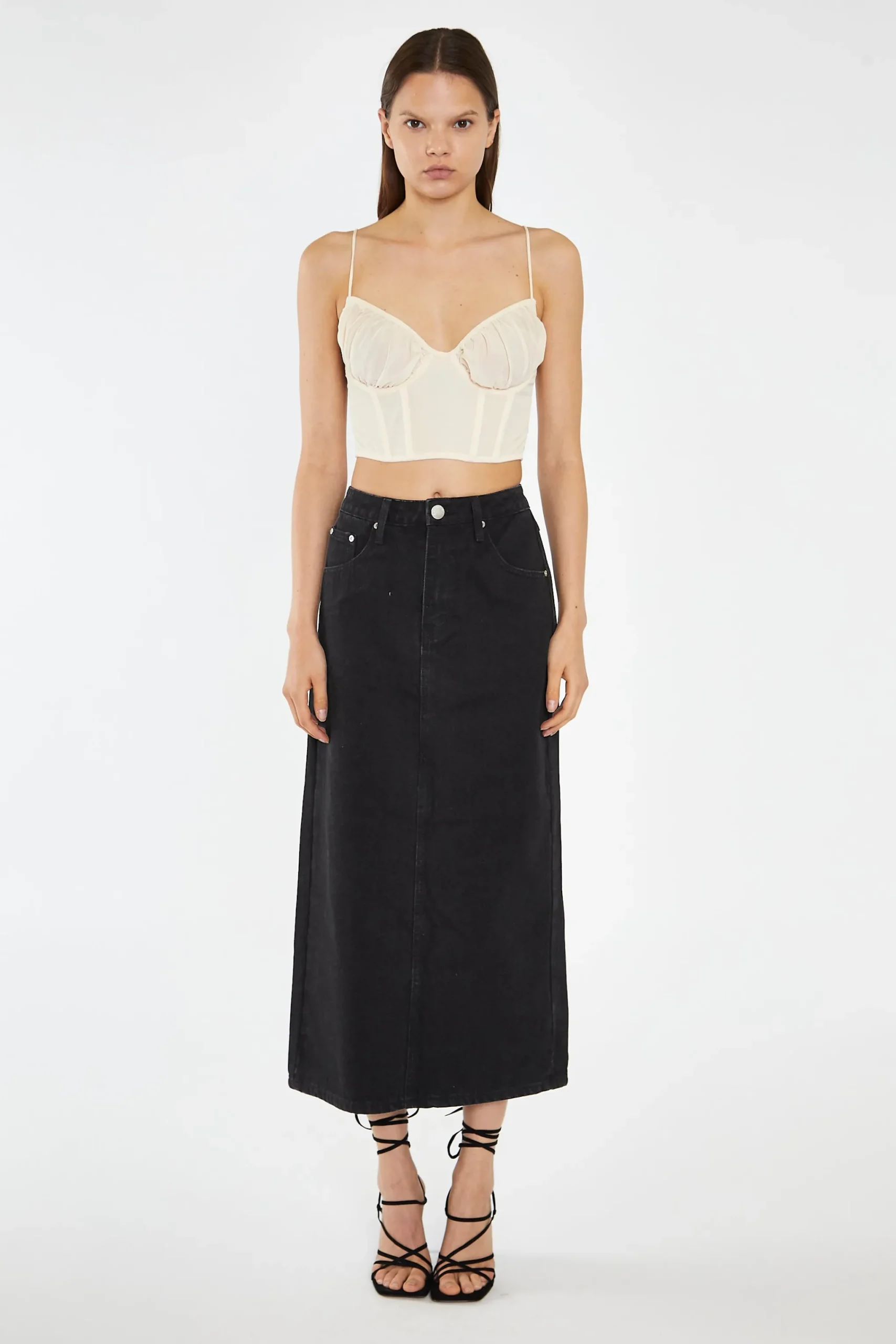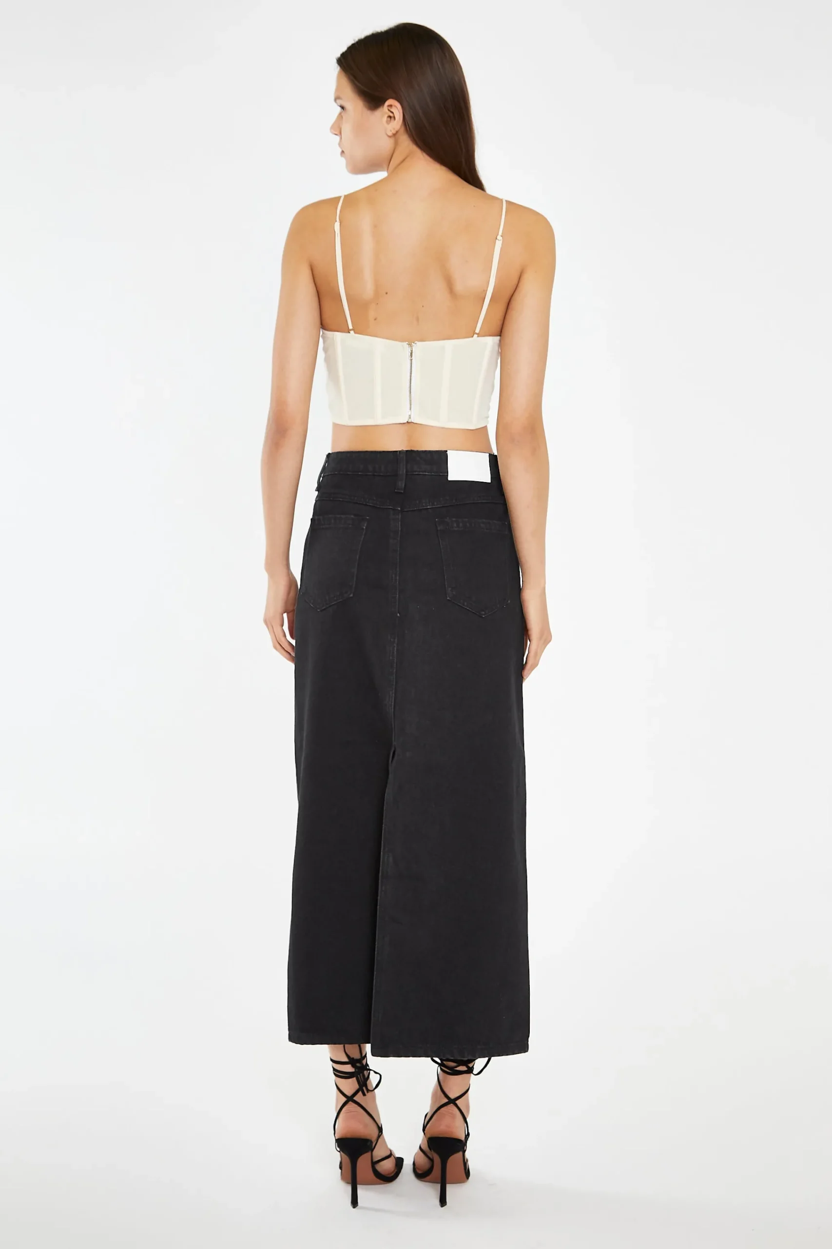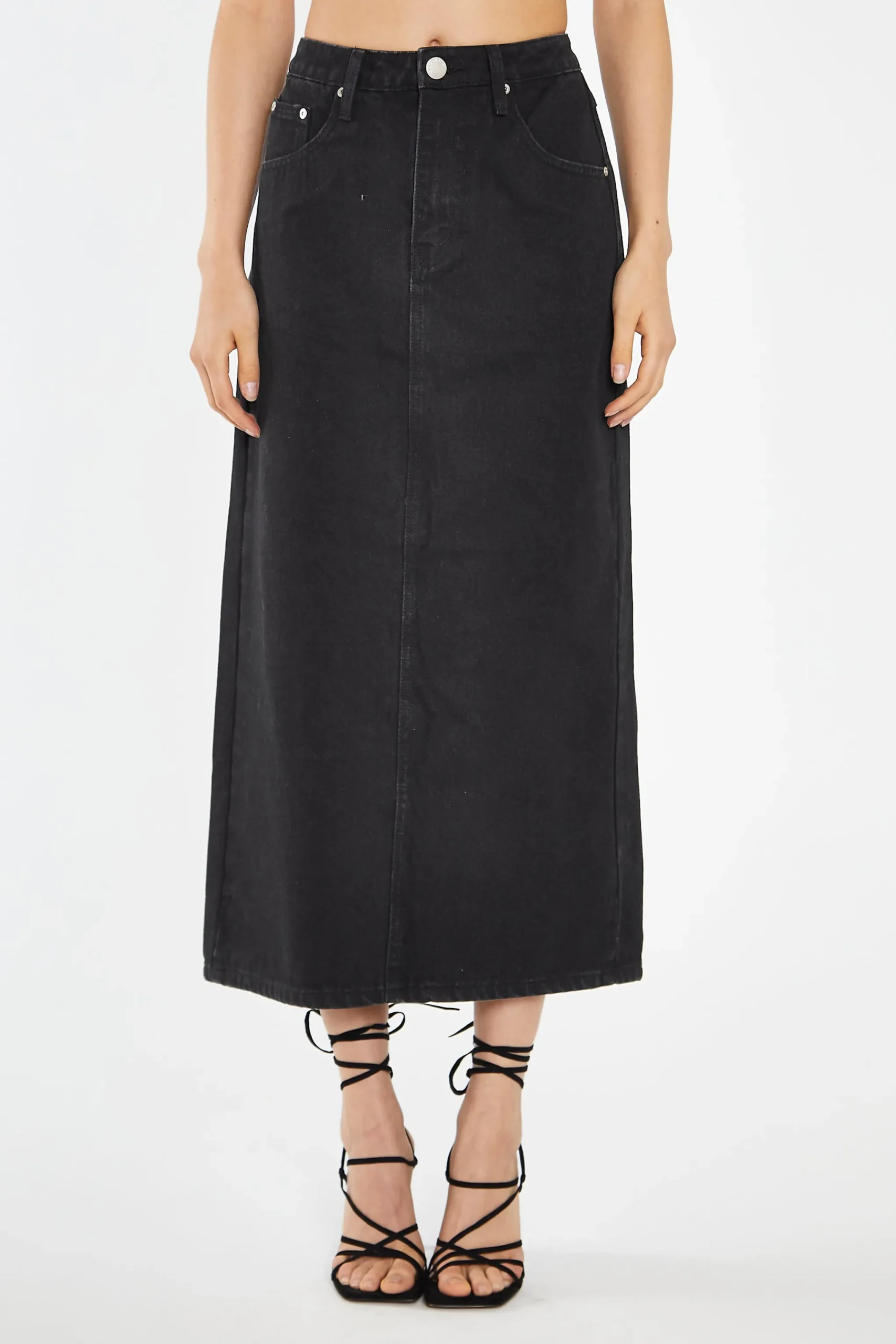 Glamorous Women’s Washed Black Straight-Fit Maxi-Skirt. Add some edge to your wardrobe with our Washed Black Straight-Fit Maxi-Skirt. Made from washed black denim, this skirt features a center black split and a flattering straight fit. Perfect for a night out or a casual day look.