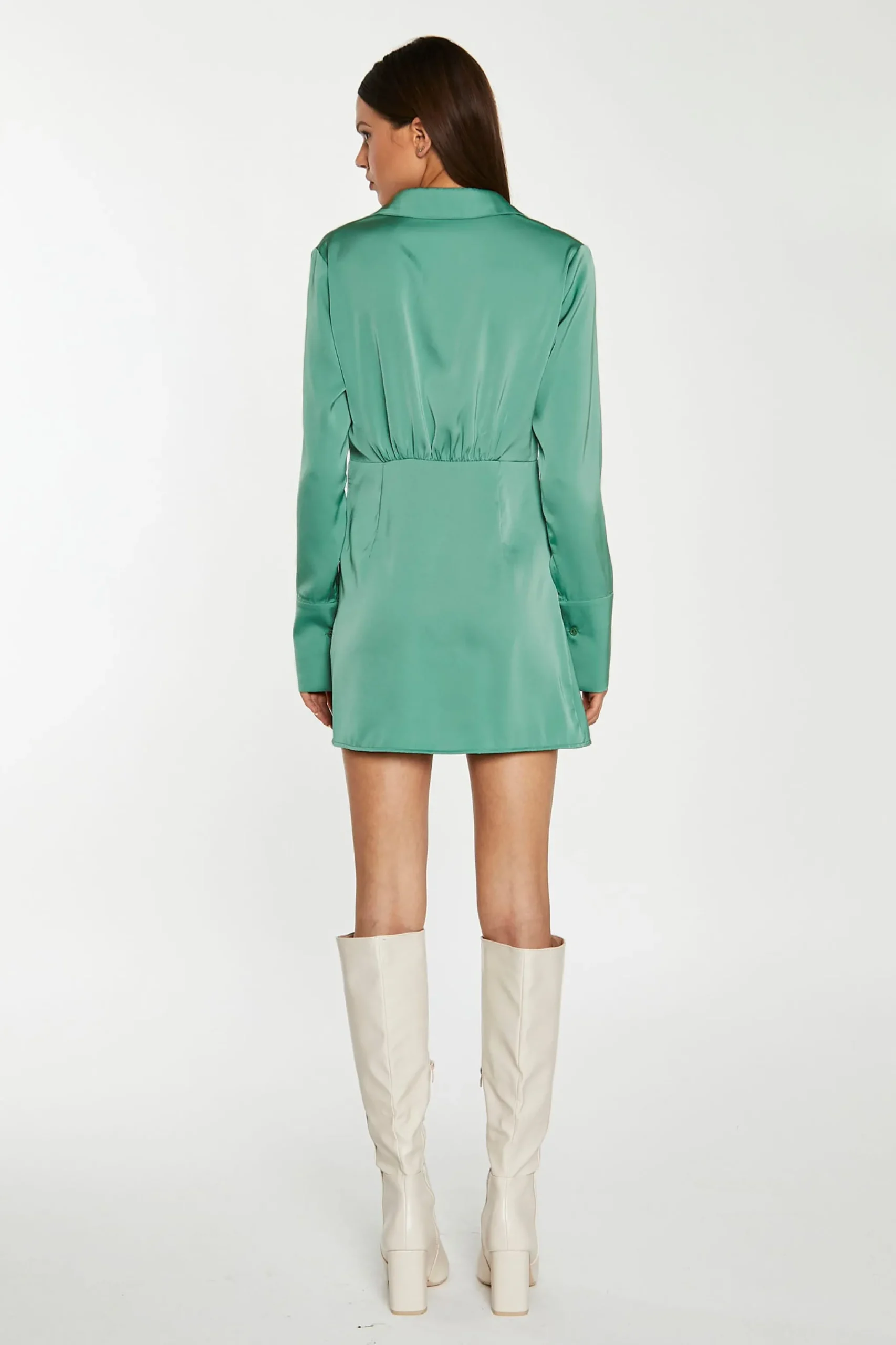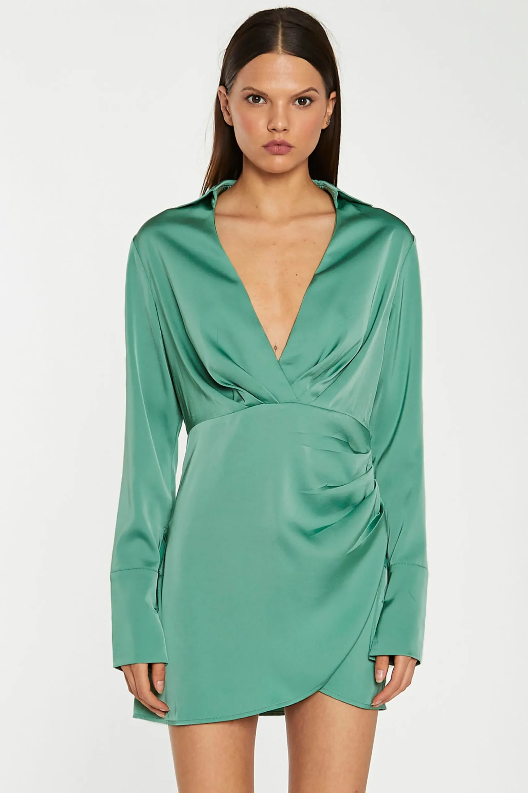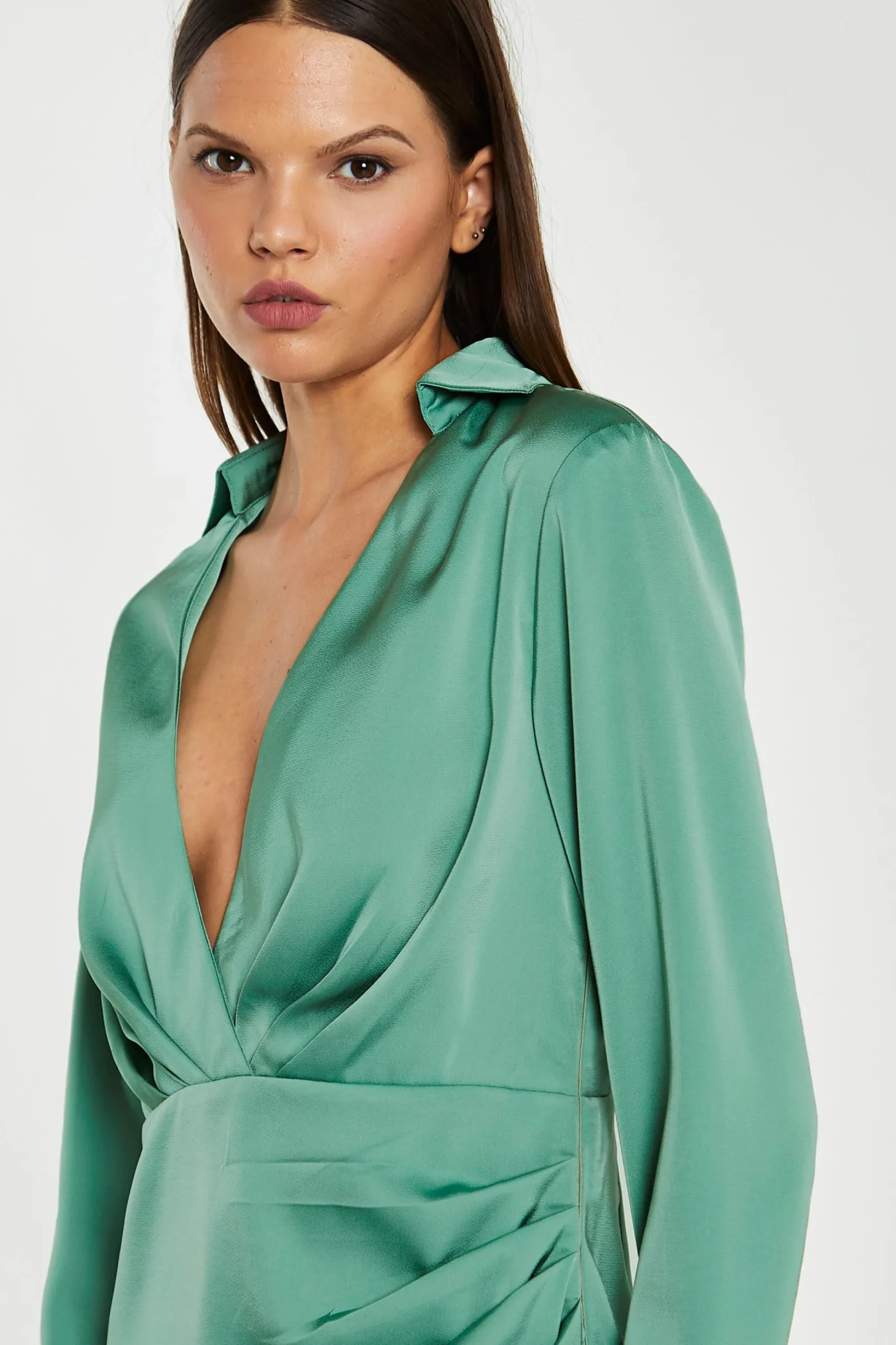 Glamorous Womens Spruce-Green Satin Collared Wrap Mini-Dress. Look your best in our Collared Wrap Mini-Dress! With a deep V neckline and collared design, this sophisticated yet daring dress is perfect for any occasion. The cuffed sleeves, gathered wrap skirt, and mini length make it an easy and chic way to show off your fashion prowess. Look good, feel good!