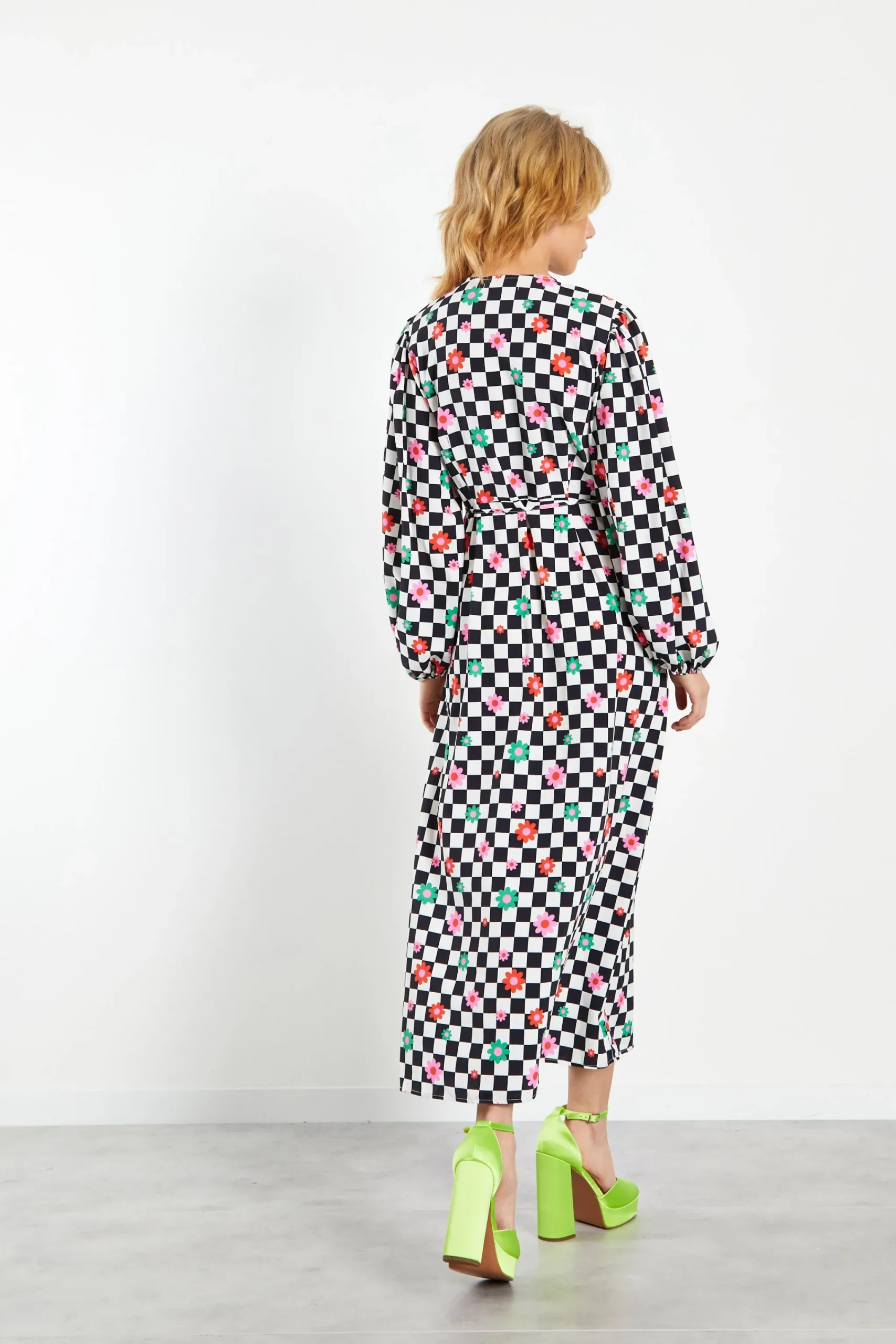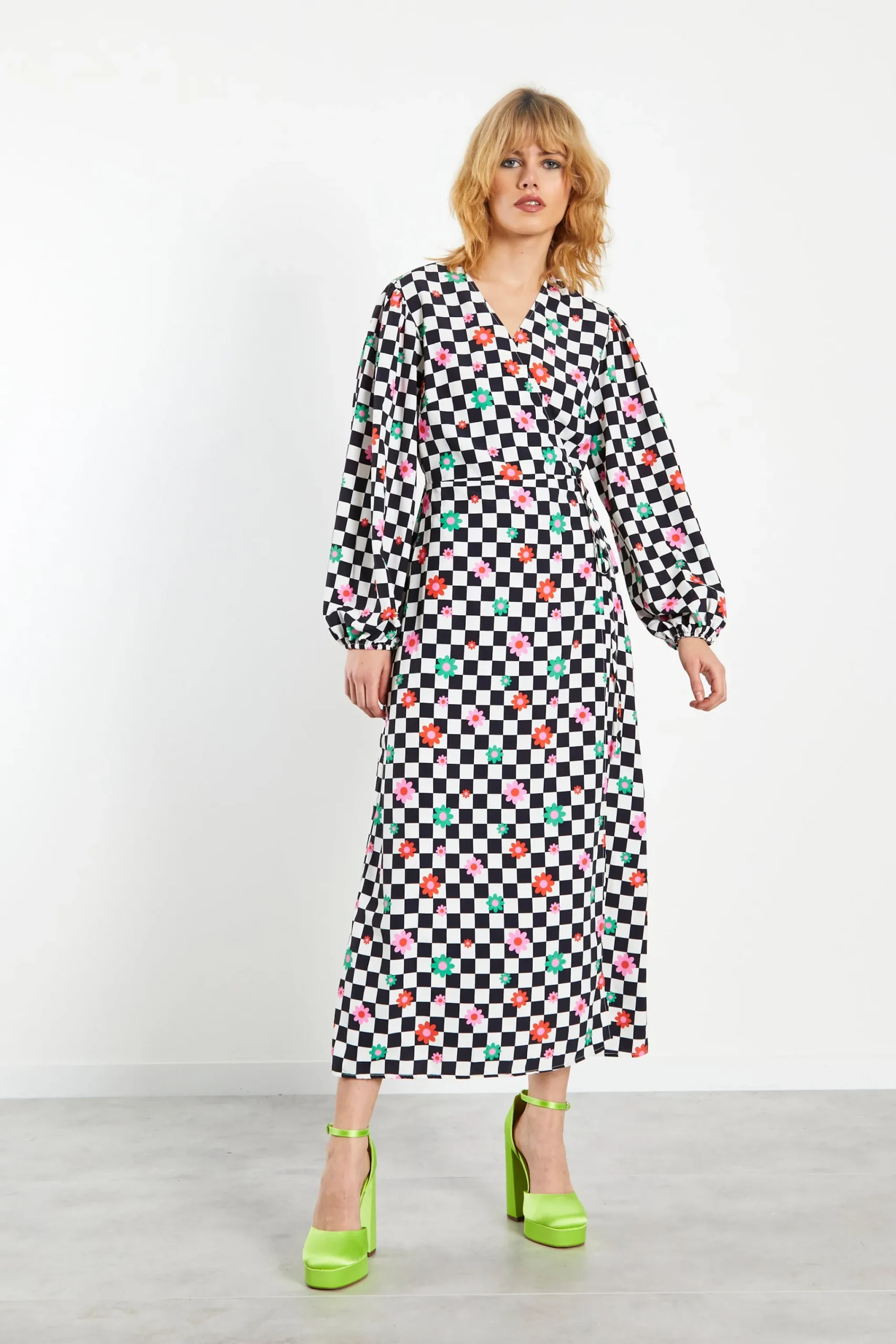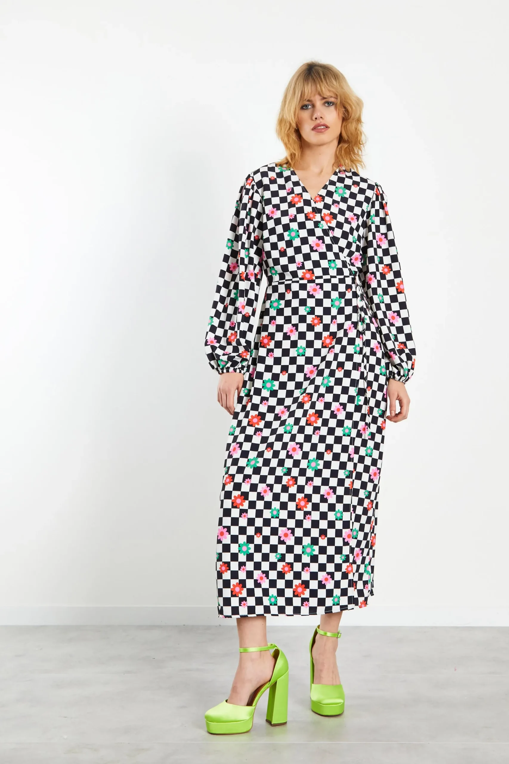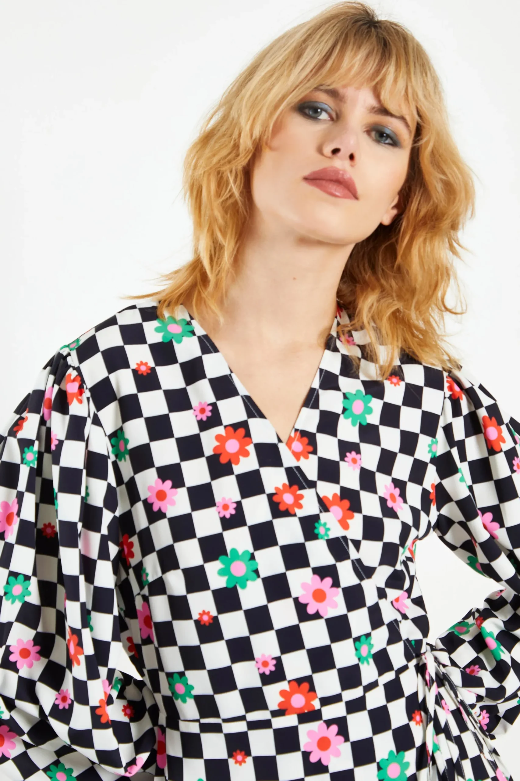 Glamorous Checkboard Flower Long Sleeve Wrap Midi Dress. Fashion forward and feminine, this graphic checkerboard flower print wrap dress is the perfect daytime look. Featuring long, puff sleeves, midi length and tie wrap front design, this dress is a super flattering addition to your closet Looks great teamed with chunky boots or dressed up with your favourite heels for cocktails with the girls.